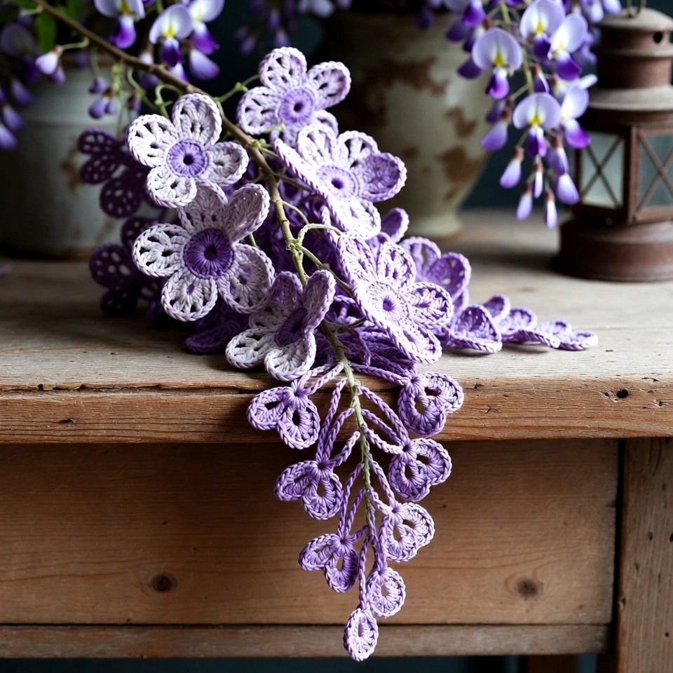 After completing a flower, chain down to create the vine. These chains act as stems. Along the chain, attach more small flower motifs at intervals. This creates the cascading wisteria effect. Keep the flowers closer together near the top and slightly spaced toward the bottom for a natural flow.
