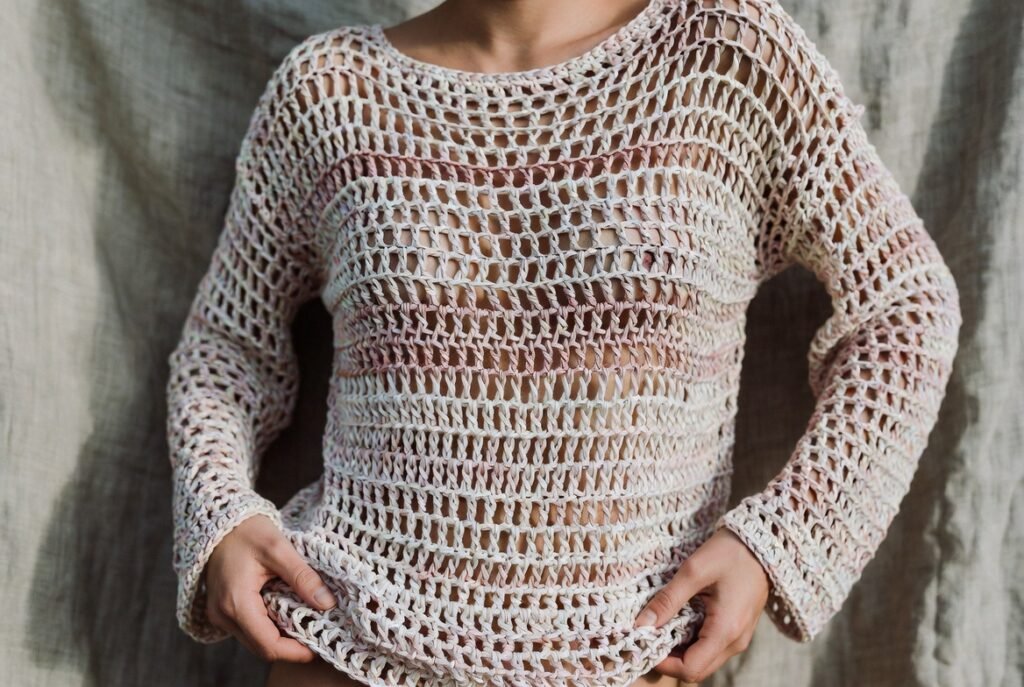 Handmade lightweight crochet summer sweater in pastel yarn.