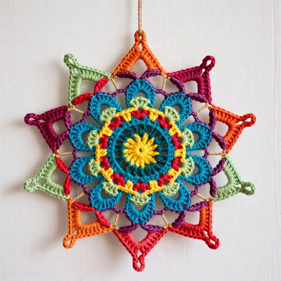 Once completed, fasten off and gently block the doily into a perfect circle. You may attach a small crystal bead or metal ring at the center or bottom to enhance the light-catching effect. Hang the finished crochet suncatcher mini doily near a window using transparent thread or fishing line for a floating appearance.